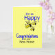 Felicitaciones por una nueva casa con el texto que estoy tan feliz por ti en azul y negro con 3 abejas personalizados en un fondo amarillo.