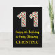La parte delantera de este sencillo y divertido diseño de tarjetas de felicitación de cumpleaños con temática de Navidades y cumpleaños, cuenta con un gran número "11", con un patrón de rayas rojas, blancas y verdes. También incluye el mensaje "Feliz cumpleaños número 11 y Feliz Navidad", y un nombre personalizado. El fondo del frente es negro de color. El interior presenta un mensaje de bienvenida de cumpleaños de personalizable, o tal vez podría ser borrado y dejado en blanco si se va a escribir un mensaje a mano. Una tarjeta de cumpleaños personalizada como esta podría ser una manera divertida de reconocer el undécimo cumpleaños de alguien que también cae el 25 de diciembre (Día del Navidad). [~Z0000405]