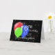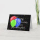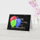 Una tarjeta de cumpleaños para el cumpleaños 16 de una nieta con fondo negro, un globo azul, rojo y verde y giros y estrellas dispersos.