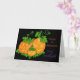 Una tarjeta de Halloween para una bisnieta con un fondo negro y una familia de tres calabazas felices con hojas y en el lado derecho en naranja y púrpura, las palabras "Feliz Primera Gran Nieta de Halloween".