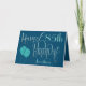 Un diseño con letras decorativas en tonos azules para los saludos de cumpleaños número 85. Happy Birthday se establece en un guión elegante en azul, y la edad está en un estilo de coordinación en verde azulado suave, junto con el nombre de tu destinatario, en un fondo azul. Puedes cambiar el mensaje interno a tu propio saludo. Faux, globos brillantemente verde azulados, que le dan el toque final perfecto en el frente. El mismo color de fondo azul continúa en el interior.