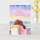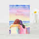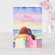 Tarjeta personalizada de feliz aniversario. Arte acuarela ai que representa a dos mujeres enamoradas abrazándose en la playa. cielos rosas y azules bonitos.
