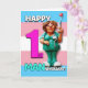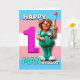 Una tarjeta para desearle a tu amigo, familiar o ser querido transgénero felicitaciones en su primer aniversario de comenzar la testosterona. Tiene un diseño de estilo de dibujos animados de una enfermera con una jeringa en un fondo de bandera del orgullo transgénero en rosa, azul y blanco. La letra frontal dice Feliz primer Manniversary. Dentro dice Feliz aniversario de tu primera inyección de testosterona.