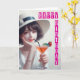 Una mujer muy hermosa con ropa de los años 30 con cumpleaños feliz delante de la tarjeta