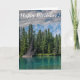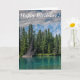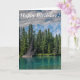 Esta es una tarjeta de cumpleaños moderadamente humorística y de buen carácter. La tarjeta es vertical con una foto de un lago, árboles y montañas tomadas en Banff en Alberta, Canadá. Lo más probable es que sea enviada por un amigo.