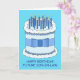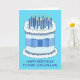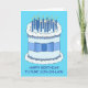Una gran torta azul y blanca de cumpleaños cubierta de velas iluminadas y colocada sobre un fondo azul brillante. Las palabras 'Feliz Cumpleaños Futuro, Hijo en Derecho' acompañan la imagen.