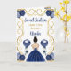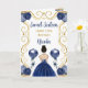 Esta dulce invitación a la tarjeta de 16 años tiene un marco dorado elegante, una bella princesa con el pelo castaño y un vestido azul marino, flores y un globo.