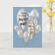 "¡¡Feliz cumpleaños!!! ¡Viejo cabra!" con letras negras, un ilustracion de una cabra vieja con una expresión melancólica en su cara en un globo. La cabra está rodeada por un montón de globos gris plateado. Una tarjeta de felicitación muy graciosa para alguien especial. El interior de la tarjeta está en blanco y en blanco.