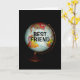 Un colorido globo antiguo, fotografiado con un fondo negro, es el tema de mi tarjeta de cumpleaños "¡Feliz cumpleaños al mejor amigo de la Tierra!". "Mejor Amigo" en texto negro en la cara del globo completa la imagen frontal de la tarjeta.