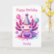 Tarjeta de cumpleaños personalizada rosa y púrpura con un axolotl lindo con un gorra de cumpleaños y globos. Dentro de la tarjeta hay una página de color. Cuidada para cualquier niñita que ame los axolotes!