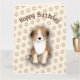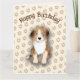 La parte delantera de la tarjeta incluye un adorable ilustracion de una Beagle juguetona, con huellas de perro al fondo.