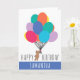Un oso de peluche marrón se aferra a un montón de globos coloridos y flota en el cielo. Personaliza esta tarjeta de "Cumpleaños Feliz" con el nombre del afortunado destinatario.