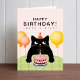 Tarjeta Feliz cumpleaños con gato negro, pastel y vela