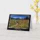 Feliz cumpleaños con vistas a las montañas y las flores. Tarjeta de cumpleaños para los amantes de la naturaleza.
