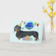 Este lindo Dachshund se ha vestido para la ocasión de desear a la amante de Dachshund en su vida un feliz cumpleaños! Un dachshund negro y marrón en un gorra fiesta. Globos que lo rodean.