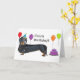 Este lindo Dachshund se ha vestido para la ocasión de desear a la amante de Dachshund en su vida un feliz cumpleaños! Un dachshund negro y marrón en un gorra fiesta. Globos rodeándolo y un pastel a sus pies.