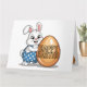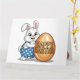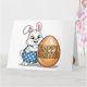 Feliz tarjeta de conejo de polit de Pascua. El lindo conejito, con overoles de polka azul y blanco, estaba orgullosamente sosteniendo un huevo de Pascua que decía "Feliz Pascua", haciéndose pasar por una pose como la de "Conejo del Año".