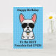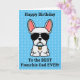 Frenchies, muéstrale a tu papá algo de amor en su cumpleaños con una tarjeta personalizada sólo de ti. El mensaje en la parte delantera de la tarjeta dice "¡Feliz cumpleaños al mejor padre francés de la historia!" El mensaje interior dice: "Te amo más que los dulces, Feliz cumpleaños". El diseño presenta un bonito ilustracion de estilo personalizado de un bulldog francés de color blanco masculino que lleva un collar azul y gafas de sol de aviador negro. Color de fuente y fondo y se debe cambiar seleccionando "Haga clic en el personalizar más adelante".