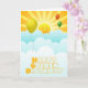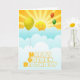 Feliz cumpleaños dorado con sol y globos. Diseñado por Janet Palaggi.