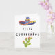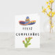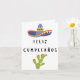 Tarjeta de cumpleaños española (tarjeta de cumpleaños) con mensaje de cumpleaños en español (Feliz cumpleaños, feliz cumpleaños en español) y ilustracion mexicano tradicional con sombrero y cactus. Incluye mensaje de cumpleaños dentro de la tarjeta, 'Feliz cumpleaños'.