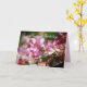 Una abeja visita hermosas flores de manzana en la parte delantera y trasera de esta tarjeta.