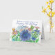 Una tarjeta de felicitación floral de cumpleaños feliz decorada con un ramo de flores con una gran margarita de gerbera azul, rosas y claveles de color rosa cameo y hortensias azules blandas dibujadas en pluma y tinta con acuarela. Encantador de enviarle a tu mamá especial en su cumpleaños. Puede cambiar o eliminar el texto para que se ajuste a sus necesidades.