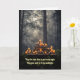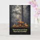Una mágica y mística tarjeta de cumpleaños feliz con velas encendidas en un bosque oscuro y un poema de bendiciones y magia.