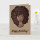 Este diseño presenta "Reina, fenomenal, bella, inteligente, mágica, jefa, amorosa, sexy, independiente, divertida, creativa y fuerte" anidada en su afro, con collares de capas en un fondo marrón. Dentro de la tarjeta dice "¡FELIZ CUMPLEAÑOS!"