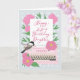 Una máquina de escribir vintage rosa rodeada de flores y hojas de peonía con un pájaro carbonero posado en la máquina de escribir. Un trozo de papel de la máquina de escribir tiene las palabras manuscritas Feliz cumpleaños 22 hija. ¡Una encantadora tarjeta de cumpleaños para tu hija! © Ness Nordberg