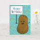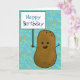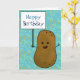 Linda patata de dibujos animados marrón feliz con una gran sonrisa en su cara. Está sosteniendo un cartel con una plantilla de texto que dice Feliz Cumpleaños. Cambie el fondo a cualquier color que desee haciendo clic en personalizar.