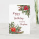 Feliz carta de Navidades de cumpleaños de navidades con follaje rústico de invierno.