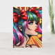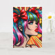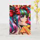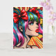 Chica de arte pop cómico colorido con cabello colorido, lápiz labial rojo y lazos en sus coletas,