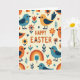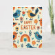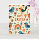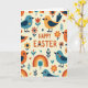 Esta tarjeta de felicitación presenta el mensaje "FELIZ PASCUA" centrado cerca de la parte superior en letras naranjas cálidas, con un pequeño corazón utilizado como detalle de punto, dando a la redacción un toque suave y afectuoso. En un fondo cremoso, pequeños pájaros estilizados se repiten en un patrón ordenado, coloreados en azul turquesa, naranja y amarillo dorado con alas azul oscuro y ojos negros simples. Algunos pájaros lucen pequeñas marcas de corazón en sus pechos, como pequeños tokens compartidos entre amigos 🐰. Alrededor de ellos, flores simplificadas en naranja y rojo se sientan junto a pequeños tallos frondosos, corazones dispersos y suaves arcos de arcoíris en tonos primarios silenciados. Las formas planas y las áreas de color sólido mantienen todo ordenado y moderno, mientras que los motivos repetidos se sienten como un coro amistoso en la página 🐇. El texto permanece claramente separado del patrón, destacando en el espacio abierto sobre los pájaros y los elementos