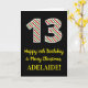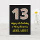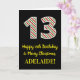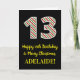 La parte delantera de este divertido y sencillo diseño de tarjetas de felicitación de cumpleaños con temática de Navidades y cumpleaños el 25 de diciembre incluye un gran número "13" con un patrón de franjas rojas/blancas/verdes, junto con el mensaje "Feliz 13 cumpleaños y Feliz Navidad", y un nombre de personalizable. El fondo del frente es negro de color. El interior presenta un mensaje de bienvenida de cumpleaños editable, o tal vez podría ser borrado y dejado en blanco si se va a escribir un mensaje a mano. Una tarjeta de cumpleaños personalizada como esta podría ser una manera divertida de enviar deseos de cumpleaños a alguien que está celebrando su décimo tercer cumpleaños y que también nació el Día del Navidad (25 de diciembre). [~Z0000405]
