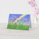 Tarjeta del Día de la Madre para la hermana con mi imagen de pequeñas flores de primavera en hierba verde, con un arco iris y cielo azul sobre el cielo. El texto de portada dice "Feliz Día de la Madre, hermana". versículo de personalizable dentro.