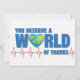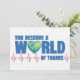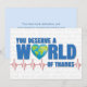 Di feliz Día del Médico con este diseño que presenta el mensaje "Te mereces un MUNDO de agradecimiento". El diseño cuenta con un elemento de globo terráqueo en forma de corazón como la letra "O" y una gráfica de electrocardiograma encima de una lista de términos médicos aleatorios. En el interior tiene este mensaje, pero se puede personalizar con tu propio mensaje. "Tu arduo trabajo, dedicación y compromiso con la atención excepcional al paciente hacen que este mundo sea un lugar mejor. Es hora de celebrarTE a TI. ¡Feliz Día del Médico!"