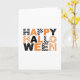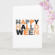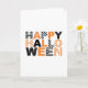 ¡Tarjeta linda de Halloween! Feliz Halloween, abucheo, calabazas, puré del monstruo, truco o invitación, trajes, galón, puntos, rayas, naranja, negro.