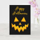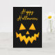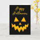 Una tarjeta de felicitación que presenta un diseño de cara de calabaza de Jack o Linterna brillante sobre negro con las palabras Feliz Halloween en la parte frontal. El interior dice "Que todos tus deseos espeluznantes se hagan realidad".