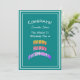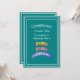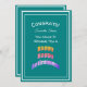 Tarjeta de jubilación de felicidades, enmarcada con tipografía azul turquesa y multicolor con un espacio para escribir el nombre y un mensaje divertido en la parte posterior.