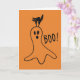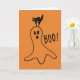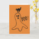 ¡Te encantará esta tarjeta de Feliz Halloween! Un fantasma lindo dice "¡Boo!" mientras un gato negro está encaramado en su cabeza. Naranja con gráficos negros. Inside dice "¡Feliz Halloween a ti!" Una versión más pequeña del fantasma y del gato negro también se imprimen en la esquina superior izquierda, a la izquierda, dentro de la tarjeta, así como en la parte posterior.