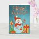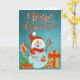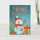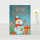 Un muñeco de nieve alegre con paquetes de regalo envueltos a su lado le desea a todos una Feliz Navidad en la parte delantera de esta tarjeta de felicitación de Navidad. El muñeco de nieve usa un sombrero de Santa y una bufanda roja, y sostiene un bastón de dulce. Las imágenes brillantes se colocan sobre un fondo verde azulado degradado. El interior tiene otra imagen de muñeco de nieve, junto con un árbol de vacaciones y más paquetes de regalo, junto con un cartel que dice "Deseos cálidos" y el texto de su personalizado en la parte inferior.