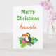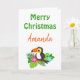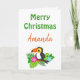 Una tarjeta navideña linda y tropical, este diseño tiene "Feliz Navidad Amanda" escrito en verde y naranja en un fondo blanco. Debajo hay un bonito pájaro toscano. El interior tiene un saludo de Navidades. Añade fotos, logotipos y texto como quieras. ¡Personaliza el tuyo hoy! Clipart: JoKavanaghDesigns https://www.etsy.com/shop/JoKavanaghDesigns