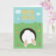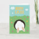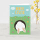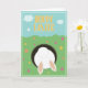 Tarjeta de felicitación de "Feliz Pascua" para desear una muy feliz Pascua; con un simpático y divertido conejo saltando en su madriguera
