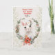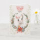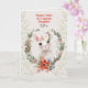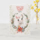 Dile Feliz Pascua a tu nieta con este diseño que presenta un adorable conejo blanco que lleva una corona de flores con la expresión más dulce en su cara. El conejo está dentro de una guirnalda de hojas y flores sobre un fondo con un diseño de hoja sutil.