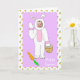Feliz tarjeta de Pascua. Tarjeta morada con fondo de zanahoria, con un adorable conejito de Pascua con la foto de su hijo dentro, que puede subir en el área personalizada!