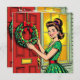 A sweet Christmas card that features a retro illustration of a mid-century woman hanging a holiday wreath on the front door. This card offers a nostalgic vintage vibe You can add a customized holiday greeting on the back or leave the little whimsical poem we put.