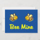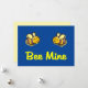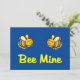 Muestra dos abejas volando, lindas, sonrientes abejas encima de las palabras "Bee Mine" en un clásico texto de escritura amarillo. Fondo azul. Personalice y personaliza la parte posterior amarilla.