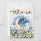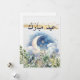Desea a tus familiares y amigos Eid Mubarak este año con esta hermosa tarjeta de vacaciones. Con encantador arte de acuarela, una luna creciente ascendente y follaje verde con eucalipto y otra vegetación floral. Los acentos de purpurina dorada hacen que esta tarjeta sea especial. Tipografía de escritura elegante. Escritura árabe de color azul marino.