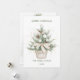 Este diseño presenta un ilustracion acuarela de árbol de Navidad con baudias y conos de pino en una olla de estilo vintage. Árbol de Navidad adornado con confetti dorado verdoso. En el reverso, una imagen delicada de los abetos y de la cabaña de madera.