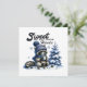 Tarjeta Festiva Adorable mapache bebiendo té caliente en la nieve.